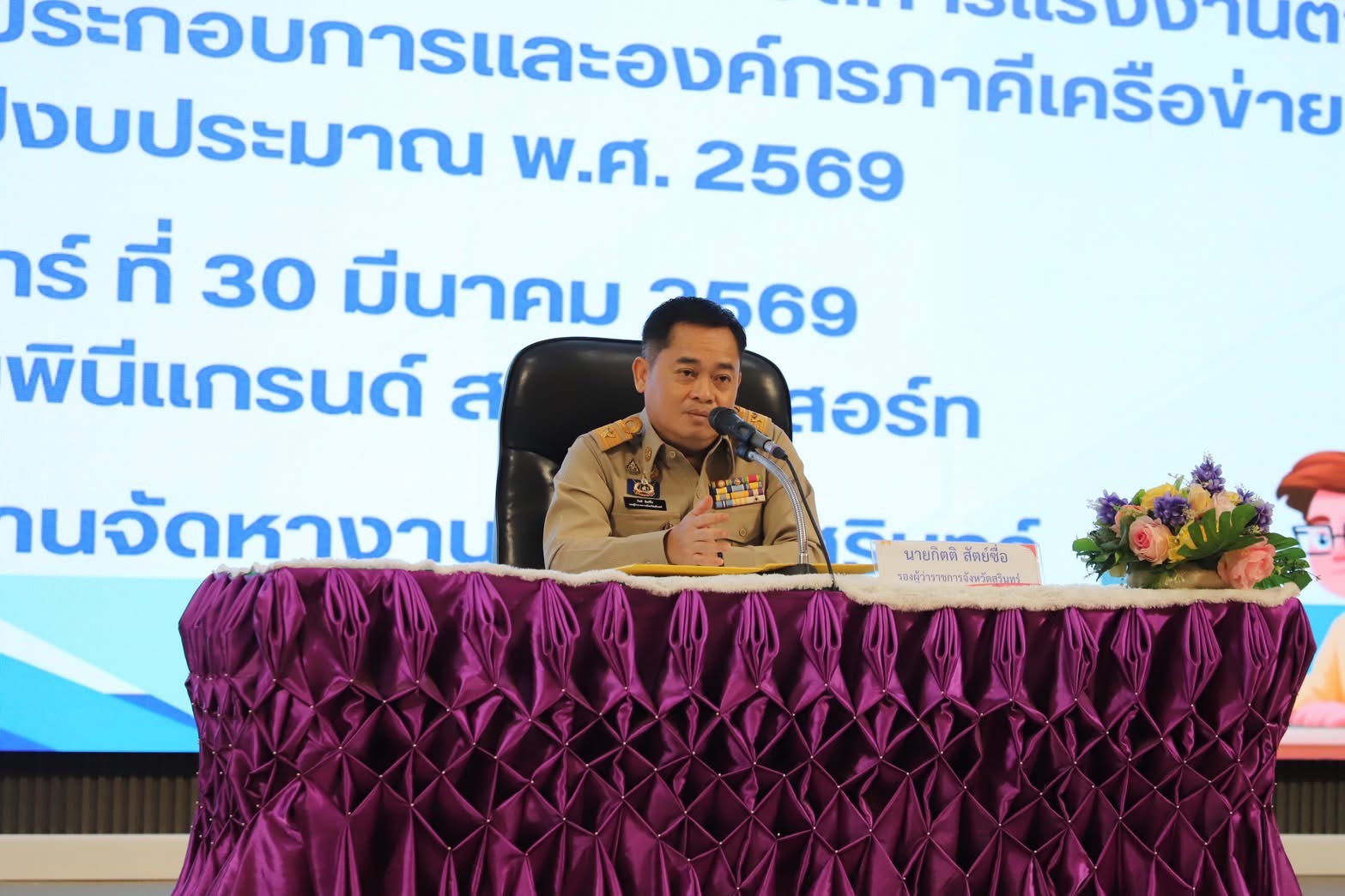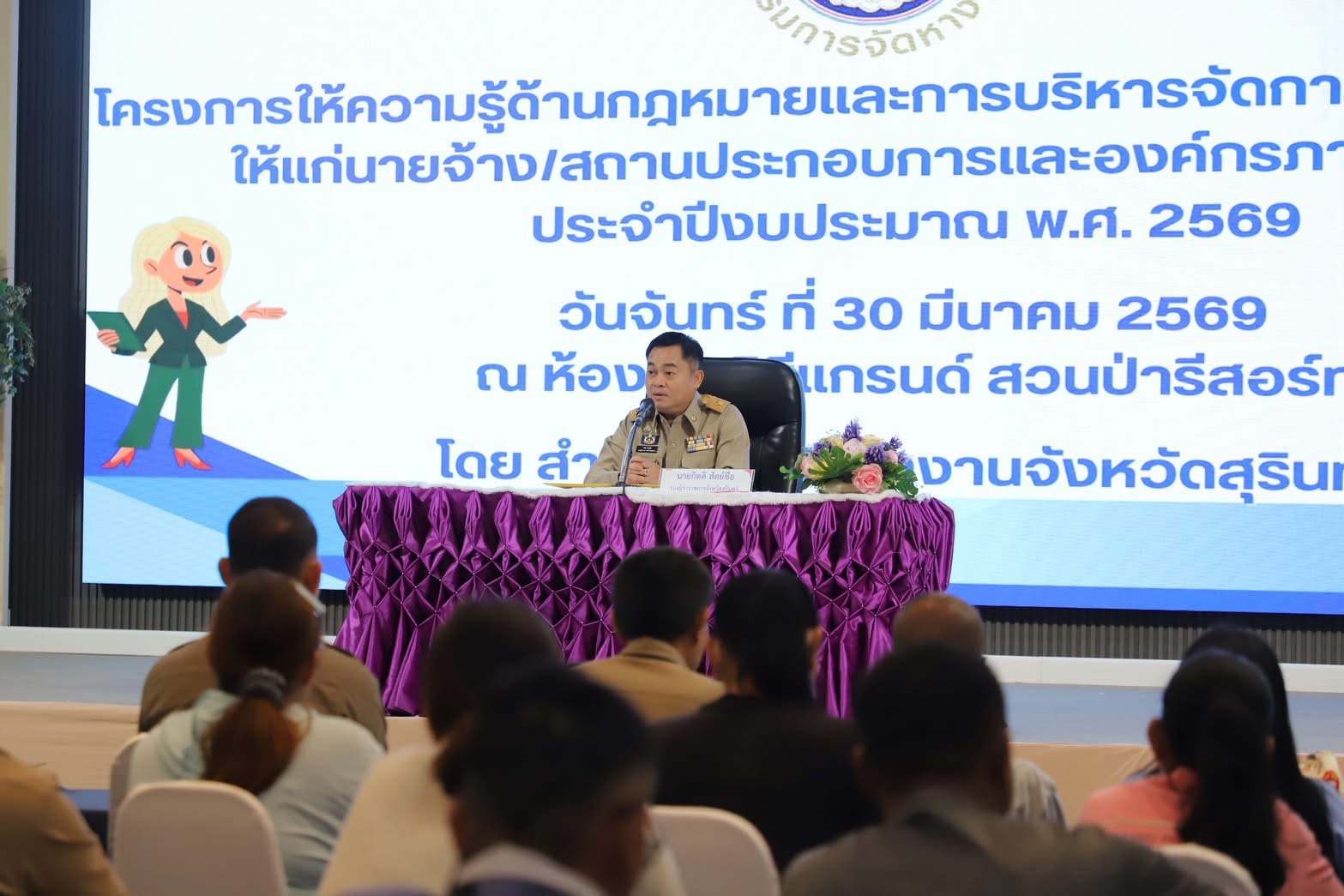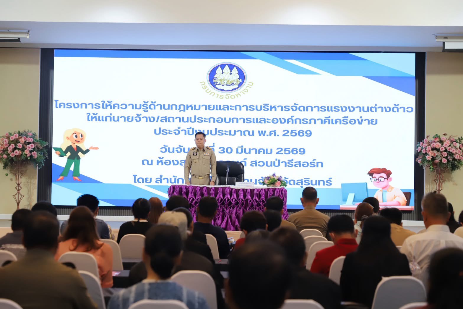 สำนักงานพลังงานจังหวัดสุรินทร์ โดยนายวิทยา ทองสัมฤทธิ์ พลังงานจังหวัดสุรินทร์ ร่วมเป็นเกียรติพิธีเปิดโครงการให้ความรู้ด้านกฎหมายและการบริหารจัดการแรงงานต่างด้าวแก่นายจ้างสถานประกอบการและองค์กรภาคีเครือข่าย ประจำปีงบประมาณ พ.ศ. 2569 นางชนากานต์ ลีพิบูลย์สวัสดิ์ จัดหางานจังหวัดสุรินทร์ กล่าวว่า จังหวัดสุรินทร์มีการใช้แรงงานต่างด้าวในหลายภาคส่วน การสร้างความรู้ความเข้าใจที่ถูกต้องจึงมีความจำเป็นอย่างยิ่ง เพื่อให้เกิดความสมดุลระหว่างความต้องการแรงงานของผู้ประกอบการกับการคุ้มครองสิทธิของแรงงาน อันจะนำไปสู่การพัฒนาเศรษฐกิจและสังคมในพื้นที่อย่างยั่งยืน โดยมีผู้เข้ารับการอบรมประกอบด้วย นายจ้าง สถานประกอบการ และองค์กรภาคีเครือข่ายในพื้นที่จังหวัดสุรินทร์ จำนวนกว่า 200 คน ณ ห้องประชุมสวนป่ารีสอร์ท ตำบลเฉนียง อำเภอเมือง จังหวัดสุรินทร์