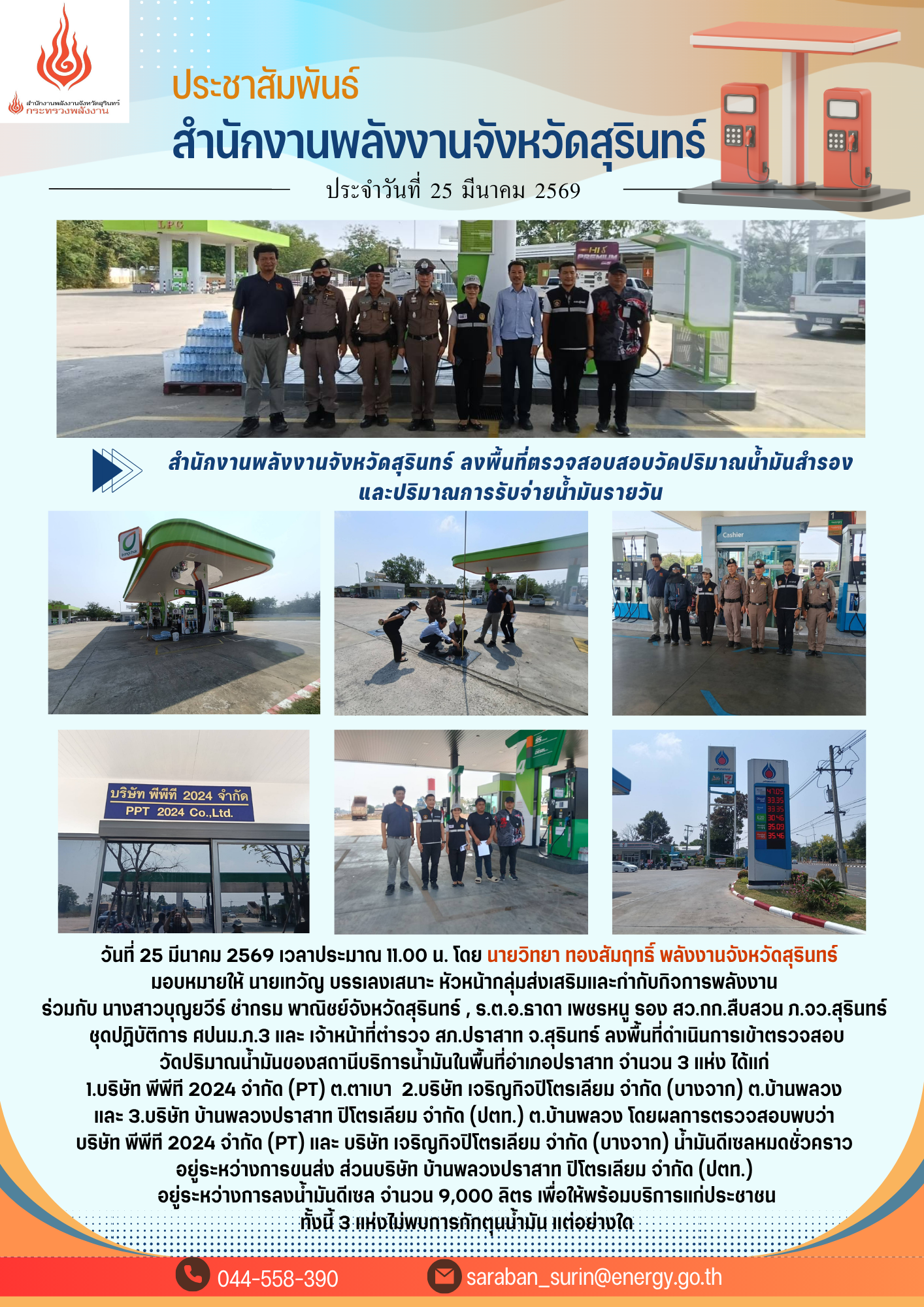 เข้าตรวจสอบวัดปริมาณน้ำมันของสถานีบริการน้ำมันในพื้นที่อำเภอปราสาท จำนวน 3 แห่ง